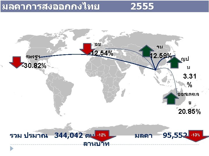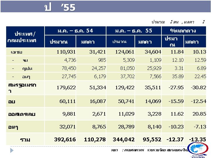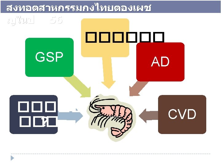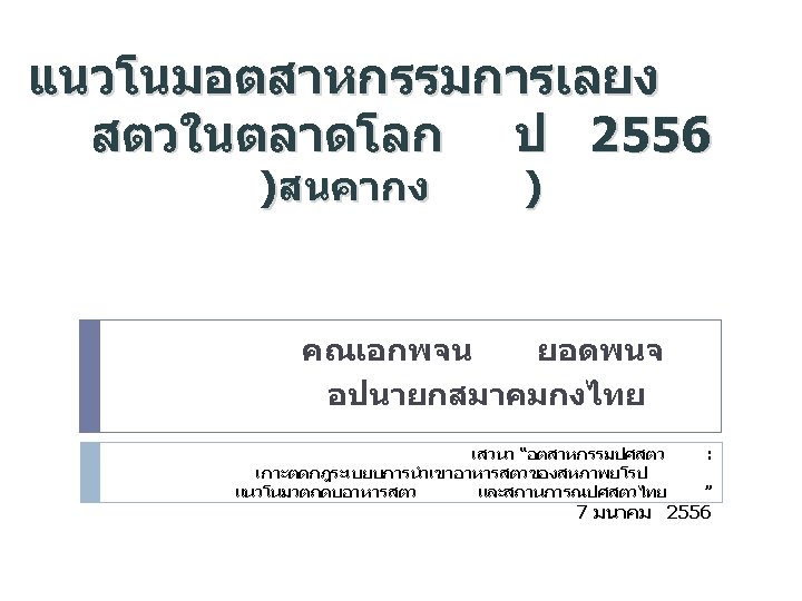 2549 2555 2549 2550 2551 2552 2553 2554 Slides: 8 Download presentation ผลผลตกงเลยงโลก ป 2549 -2555 หนวย : พนตน ประเทศ/ป 2549 2550 2551 2552 2553 2554 2555 %เปลยน แปลง (54/55) ไทย 500 530 495 563 640 600 540 -10% จน 400 480 523 560 600 565 450 -20% เวยดนาม 150 170 200 215 240 170 -29% อนโดนเซย 260 210 230 180 140 150 105 -30% อนเดย 103 110 87 100 137 170 190 +12% มาเลเซย 42 62 68 92 105 73 57. 4 -21% ฟลปปนส 36 38 29 35 40 42 40 -5% อเมรกา กลาง-ใต 395 397 412 410 422 432 +2% 55 55 55 50 65 65 45 -31% 1, 941 2, 050 2, 084 2, 192 2, 352 2, 317 2, 024. 5 -13% อนๆ รวม สมาคมกงไทย ทมา : ผลผลตกงไทย ป ปรมาณ (ตน ( %เปลยนแปลง 2542 250, 000 2543 290, 000 13. 79 2544 320, 000 9. 37 2545 263, 000 21. 67 - 2546 370, 000 28. 92 2547 360, 000 2. 78 - 2548 380, 000 5. 27 2549 500, 000 24. 00 2550 530, 000 5. 66 2551 495, 000 7. 55 - 2552 563, 000 13. 74 2553 640, 000 13. 68 2554 600, 000 -6. 25 2555 540, 000 -10. 00 ทมา : สมาคมกงไทย ปรมาณและมลคา การสงออกกงไทย 2540 -2555 ตน 450000 ลานบา ท 120000 400000 110000 350000 100000 300000 90000 250000 80000 200000 70000 150000 60000 100000 50000 2541 2542 2543 2544 2545 2546 2547 2548 2549 2550 2551 2552 2553 2554 2555 ������ 211955241983240529249633255568212091234277240841280158338410354664358926390395427580392616344042 ������ 75690 95783 87581 107891 98680 73947 71847 67289 71572 86720 81503 84196 93404 100948110278 95552 ทมา : สมาคมกงไทย
