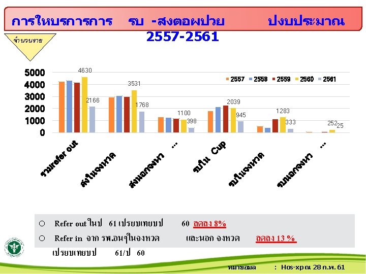 สถตบรการปงบประมาณ 2557 - 2561 แยกรายตก เปรยบเทยบจำนวนราย ป 2557 – 2561 แยกรายตก ขอมล ราชพฤกษ (3 ราชาวด (30)ตนคณ 0) 2557 2558 2559 2560 2561 3429 3316 3967 4232 1306 2057 2537 3053 3234 856 ตกสงฆ (21 (30) ) 2501 0 1192 2427 376 1167 เปรยบเทยบอตราครองเตยง 2856 1119 1014 3097 1521 882 904 596 409 ราชพฤกษ (ราชาวด (30)ตนคณ (30ตกสงฆ (21 30) ) ) 2557 2558 2559 2560 2561 99, 4 94, 1 109, 5 112, 9 84, 2 71, 5 86, 9 101, 8 125, 0 90, 1 LR(4) 84, 6 84, 4 107, 4 15, 3 94, 2 0, 0 23, 0 61, 7 63, 8 63, 6 ICU(8) 49 78 ป 74 305 62 LR(4) ICU(8) 95, 3 89, 1 157, 2 127, 8 145, 9 18, 1 45, 0 62, 5 53, 9 42, 5 : hos xp ณ 28 ก. พ. 61 NICU(2) ศลย 12 15 2557 19 ขอมล 30 8 2(30) 0 0 0 – 25610 แยกรายตก 0 0 : hos xp ณ 28 ก. พ. 61 221 207 775 765 NICU(2) ศลย 11, 4 9, 5 10, 3 41, 9 15, 2 1(30)ศลย 0, 0 53, 3 72, 1 2(30) 0, 0 56, 0 69, 6