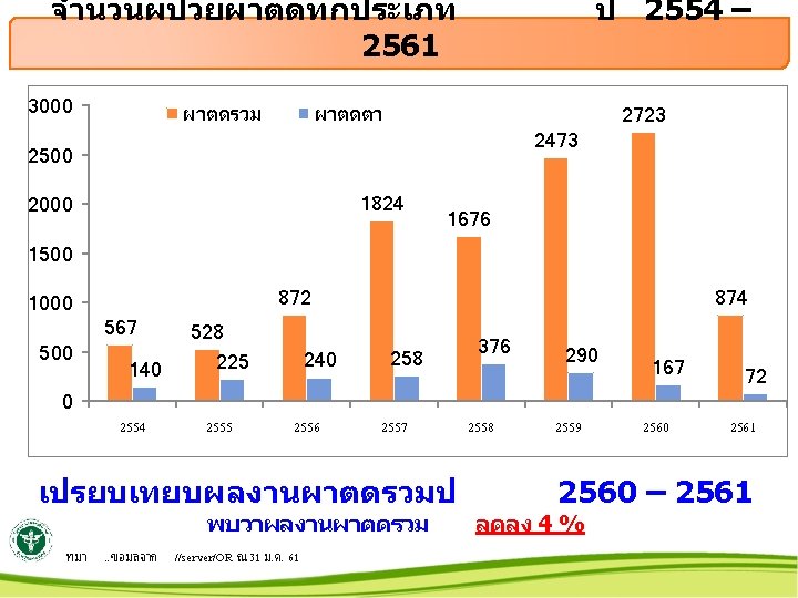จำนวนครงการผาตดเลก จำนวนราย /ผาตดใหญ 2554 -2561 ปงบประมาณ ผาตดเลก 2000 1768 1800 1596 1600 1400 1200 1000 899 779 800 535 600 400 877 249 316 218 627 766 788 623 475 291 245 200 0 2554 2555 2556 ทมา. . ขอมลจาก //server/OR ณ 31 ม. ค. 61 2557 2558 2559 2560 2561