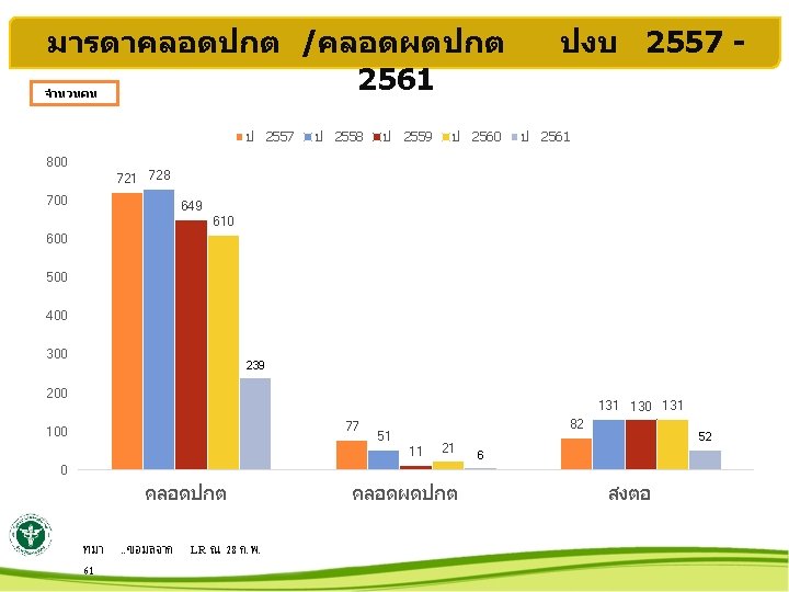 จำนวนรอคลอดและมารดาคลอด ป 2552 - 2561 จำนวนคน 1200 1030 1010 934 857 800 810 902 907 994 881 922 798 773 895 842 818 728 660 631 รอคลอด 600 คลอด 352 287 400 200 0 2552 2553 2554 ทมา. . ขอมลจาก LR ณ 28 ก. พ. 61 2555 2556 2557 2558 2559 2560 2561 ปงบ