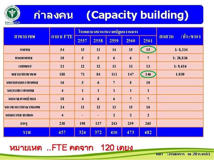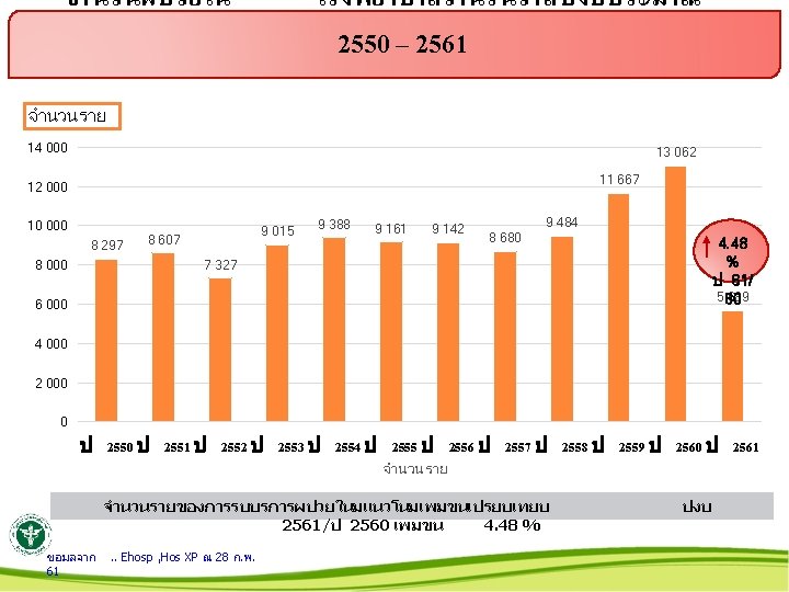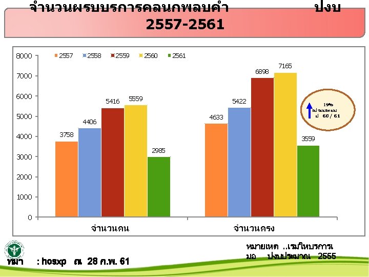 ผรบบรการกายภาพบำบด 2561 20000 18000 16000 14000 12000 10000 8000 6000 4000 2000 0 จำนวนคน จำนวนครง ปงบ 255339% เปรยบเท ยบ ป 60/61 2553 778 1614 2554 5651 7051 ทมา. . ขอมลจาก //server/PT ณ 28 ก. พ. 61 2555 2556 2557 2558 2559 2560 2561 6799 7293 8217 8584 8930 10381 6380 9408 10957 13420 15086 16016 18181 10548