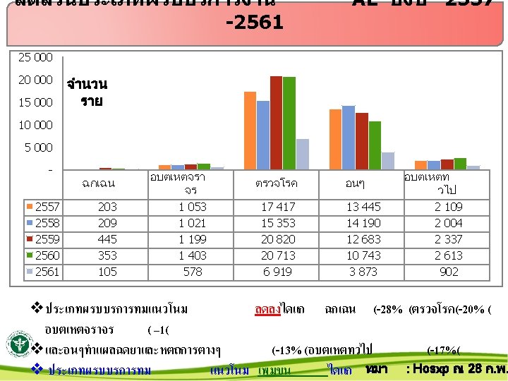 สดสวนผปวยงานอบตเหตแยกเวรตางๆ 2557 -2561 ปงบ จำนวนร าย 25 000 เช า 20 176 20 000 18 275 17 438 17 863 15 000 13 353 11 160 13 930 12 032 10 000 6 697 5 000 4 189 3 920 3 955 4 034 4 349 1 331 - 2557 2558 2559 2560 ทมา 2561 : Hos xp ณ 28 ก. พ. 6