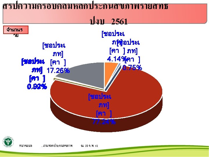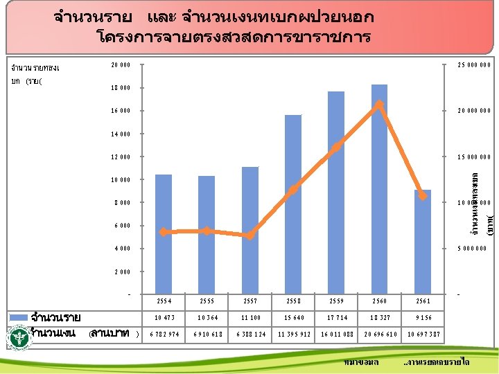 สรปการเรยกเกบเงนสทธประกนสงคม 2561 ป 2554 - 7000000 6000000 จำนวนเงน 5000000 เปรยบเทยบ ป 60/61 4000000 45% 3000000 2000000 1000000 0 จำนวนราย จำนวนเงน ทมาขอมล 28 ก. พ. 61 2554 2555 2556 2557 2558 2559 2560 2561 2239 2793 3202 3597 4455 5163 6160 2643 1 392 842 1 794 694 2 103 173 2 639 099 4 205 227 6 078 035 5 637 929 3 408 740 . . งานเรยกเกบรายได ณ