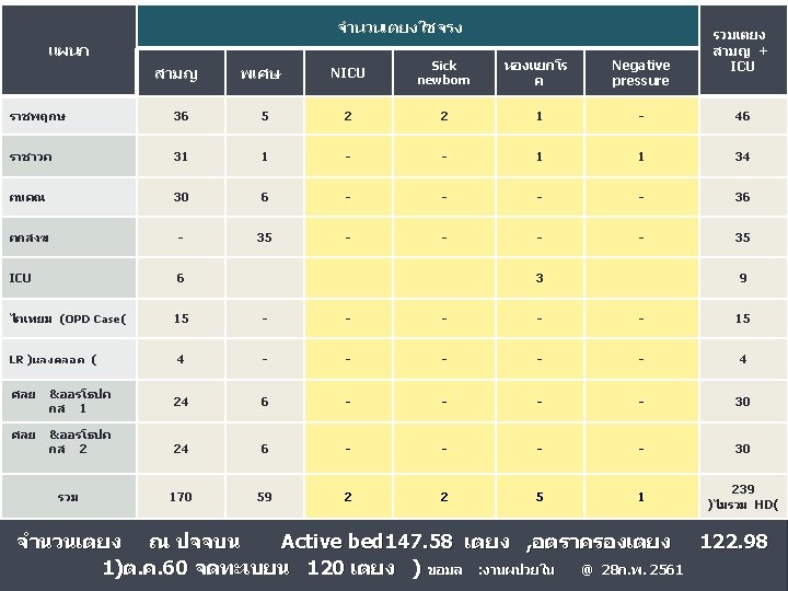 สถตบรการปงบประมาณ แยกรายตก เปรยบเทยบ 2557 - 2561 Active Bed ป 2557 – 2561 แยกรายตก 40, 0 35, 0 30, 0 25, 0 20, 0 15, 0 10, 0 5, 0 0, 0 2557 2558 2559 2560 2561 ราชพฤกษ (3 ราชาวด (30) ตนคณ 0) 29, 8 28, 2 32, 8 33, 9 25, 2 21, 5 26, 1 30, 6 37, 5 27, 0 (30)ตกสงฆ 25, 4 25, 3 32, 2 34, 6 28, 3 (21) 0, 0 3, 7 9, 9 13, 4 13, 2 LR(4) ICU(8) NICU(2) 7, 6 7, 1 6, 3 5, 1 5, 8 0, 5 1, 4 2, 5 4, 3 3, 4 0, 2 0, 4 0, 8 0, 3 ขอมล ศลย 1(30) ศลย 0, 0 16, 0 21, 6 2(30) 0, 0 16, 8 20, 9 : hos xp ณ 28 ก. พ.