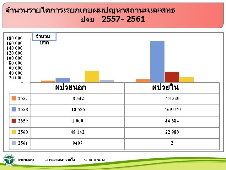 ผรบบรการกายภาพบำบด (ผปวยใน 2553 -2561 ) ปงบ 4 500 4 000 เพมข น 11% เปรยบเท ยบ ป 60/61 3 500 3 000 2 500 2 000 1 500 1 000 500 จำนวนคน จำนวนครง 2553 107 307 2554 220 550 2555 293 902 ทมา. . ขอมลจาก //server/PT ณ 28 ก. พ. 61 2556 339 1 428 2557 318 1 768 2558 525 2 291 2559 749 3 577 2560 875 4 284 2561 456 1 973