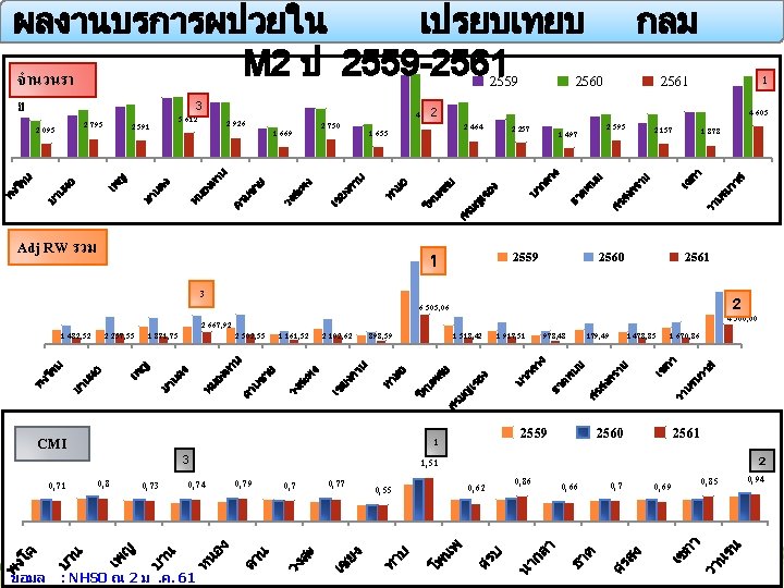 โรงพยาบาล พงโคน บานผอ เพญ บานดง หนองหาน ดานซาย วงสะพง เชยงคาน ทาบอ โพนพสย ศรบญเรอง นากลาง ธาตพนม ศรสงคราม เซกา วานรนวาส 2559 5, 774 6, 163 7, 465 8, 594 8, 065 4, 365 7, 276 4, 599 11, 979 7, 783 5, 485 4, 651 6, 015 5, 072 6, 602 10, 403 จำนวนราย 2560 5, 333 6, 945 7, 758 8, 860 8, 069 4, 431 7, 034 4, 924 12, 072 8, 086 6, 253 4, 367 6, 390 6, 244 6, 655 11, 779 2561 2, 093 2, 793 2, 591 3, 612 2, 926 1, 669 2, 750 1, 653 4, 180 2, 464 2, 257 1, 497 2, 593 2, 137 1, 878 4, 605 Adj RW รวม 2559 4, 264. 15 4, 503. 52 5, 184. 58 5, 483. 47 5, 406. 10 3, 281. 55 4, 916. 55 2, 584. 96 15, 396. 75 5, 693. 75 4, 016. 94 3, 055. 66 4, 206. 13 3, 861. 56 4, 988. 31 9, 077. 47 2560 4006. 46 5, 946. 75 5, 666. 56 6, 126. 99 6, 365. 54 3, 018. 19 5, 485. 19 2, 673. 19 17, 576. 12 5, 995. 73 4, 876. 65 2, 905. 39 4, 570. 91 4, 615. 95 4, 743. 56 11, 184. 56 2561 1, 482. 32 2, 237. 39 1, 871. 75 2, 667. 92 2, 302. 35 1, 161. 32 2, 102. 62 898. 59 6, 303. 06 1, 518. 42 1, 917. 31 978. 48 1, 797. 49 1, 478. 85 1, 670. 86 4, 300. 00 ขอมล 2559 0. 74 0. 79 0. 70 0. 64 0. 67 0. 75 0. 68 0. 57 1. 29 0. 74 0. 66 0. 70 0. 76 0. 88 CMI 2560 0. 75 0. 86 0. 73 0. 79 0. 68 0. 78 0. 55 1. 46 0. 75 0. 78 0. 67 0. 72 0. 74 0. 72 0. 95 2561 0. 71 0. 80 0. 73 0. 74 0. 79 0. 70 0. 77 0. 55 1. 51 0. 62 0. 86 0. 66 0. 70 0. 69 0. 85 0. 94 : NHSO ณ 2 ม. ค. 61