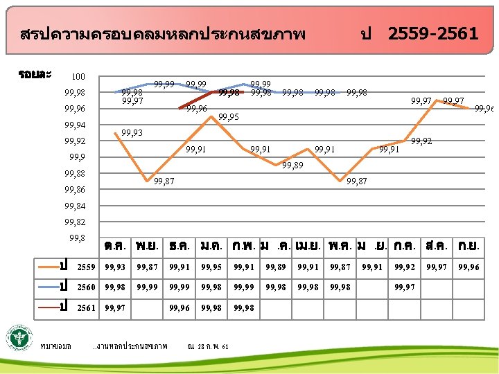 5 อนดบสภาวะสขภาพทสำคญ (ณ. 31 ต. ค 60) อนด บ ผปวยนอก 1 ESRD 2 HT 3 DM 4 5 * Dyspepsia Common clod ผปวยใน Re-admit Refer out Refer in Dead CA rectum schizophrenia ESRD Diarrhea CHCA CA Breast injury of head - CHCA Pneumonia CHF Acute appendicitis - Acute Bronchitis CA colon Leiomyoma of uterus Stroke - Cholelithiasis Diarrhea Calculus of gallbladder - Pneumonia หมายเหต. . Dead ใน รพ. , ขอมลจาก Hos. XP . . . โปรแกรม Pneumonia