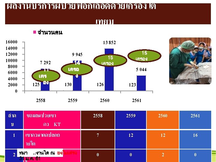 ผรบบรการกายภาพบำบด (ผปวยนอก 2553 -2561 ) ปงบ 16 000 14 000 48% เปรยบเท ยบ ป 60/61 12 000 10 000 8 000 6 000 4 000 2 000 จำนวนคน จำนวนครง 2553 671 1 307 2554 5 431 6 501 2555 6 506 8 506 ทมา. . ขอมลจาก //server/PT ณ 28 ก. พ. 61 2556 6 954 9 529 2557 7 899 11 652 2558 8 059 12 795 2559 8 181 12 439 2560 9 506 13 897 2561 5 924 8 575