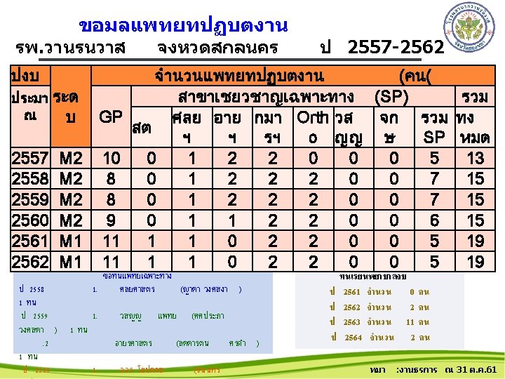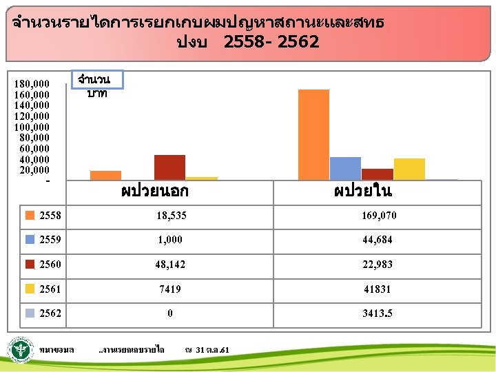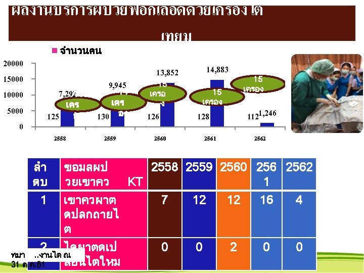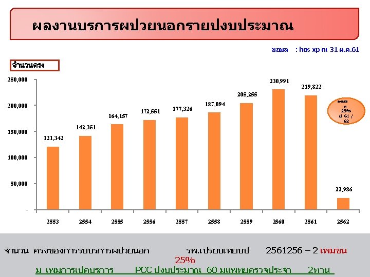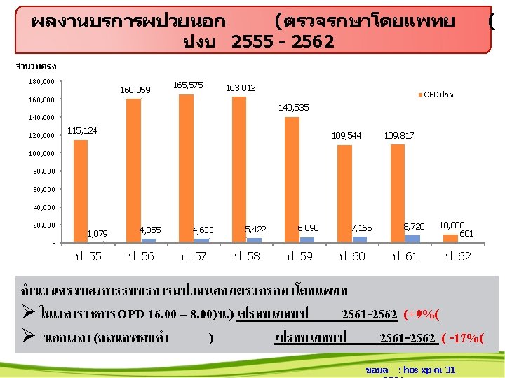 สถตบรการปงบประมาณ 2558 - 2562 แยกรายตก เปรยบเทยบจำนวนราย ป 2558 – 2562 แยกรายตก ขอมล ราชพฤกษ (3 ราชาวด (30)ตนคณ 0) 2558 2559 2560 2561 2562 3316 3967 4232 3210 235 2537 3053 3234 1996 167 94. 1 109. 5 112. 9 84. 0 75. 8 86. 9 101. 8 125. 0 81. 0 76. 6 (24) PP & สต นรเว. . . 2427 376 1167 2856 1119 1014 เปรยบเทยบอตราครองเตยง 3097 1521 882 2171 1439 954 174 96 84 ราชพฤกษ (3 ราชาวด (30)ตนคณ 0) 2558 2559 2560 2561 2562 (30)ตกสงฆ (24 PP&สต (30) ) 14) 84. 4 107. 4 15. 3 84. 7 77. 8 23. 0 61. 7 63. 8 59. 1 40. 9 89. 1 157. 2 127. 8 40. 4 41. 2 ( ICU(8) 78 74 305 431 34 ICU(8) 45. 0 62. 5 53. 9 56. 4 46. 4 ป : hos xp ณ 31 ต. ค. 61 NICU(2) ศลย 1(30) ศลย 2(30) 15 0 0 19 – 2562 0 แยกรายตก 0 2558 30 221 207 ขอมล : hos xp ณ 31 ต. ค. 61 22 1820 1867 2 134 135 NICU(2) ศลย 9. 5 10. 3 41. 9 20. 3 41. 9 1(30)ศลย 0. 0 53. 3 68. 9 53. 8 2(30) 0. 0 56. 0 67. 5 55. 4