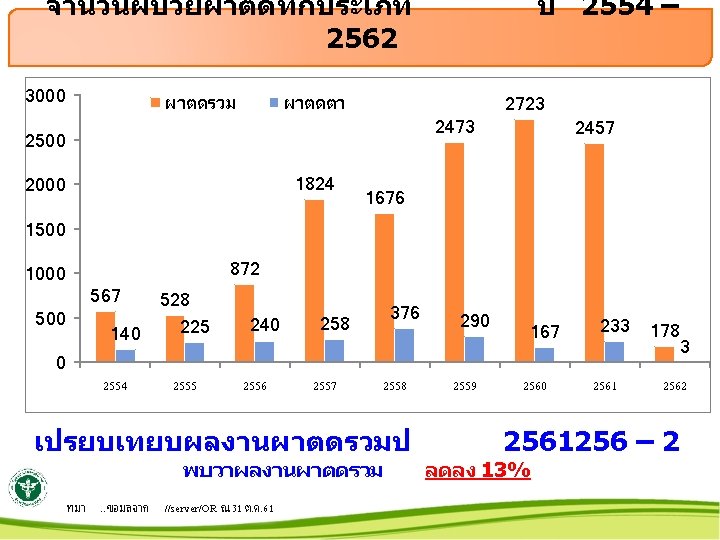 จำนวนผาตดแยกแผนก 1600 1494 1362 1400 1200 ปงบ 2558 -2561 2558 2559 2560 2561 2562 1184 1045 1000 854 819 800 777 600 ทมา. . ขอมลจาก //server/OR ณ 31 ต. ค. 61 เว าร กม ะด ก ศล ยก ร รม กร ศล ยก รร ม ช 0 122 167 9 3 25 0 1 42 12 84 93 85 ช 73 87 เว 49 สต 73 233 ตา 91 200 162 นร 376 290 400 113 14