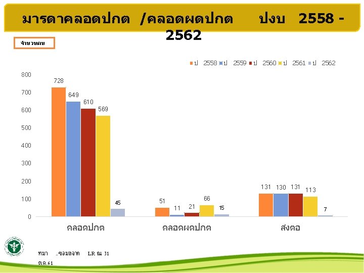 จำนวนรอคลอดและมารดาคลอด ป 2553 - 2562 จำนวนคน 1200 1030 1000 800 934 810 902 907 รอคลอด 994 881 922 798 773 895 728 คลอด 842 660 818 631 นรเวช 811 634 600 400 200 64 60 12 0 2553 2554 2555 ทมา. . ขอมลจาก LR ณ 31 ต. ค. 61 2556 2557 2558 2559 2560 2561 2562 ปงบ