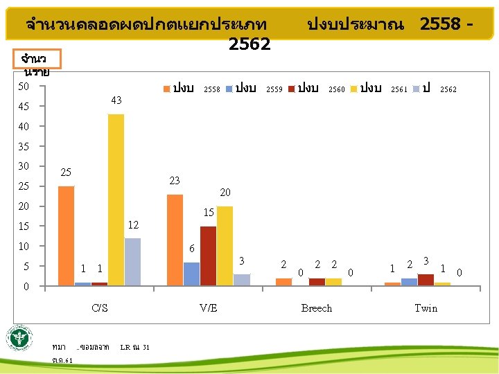 ภาวะแทรกซอนขณะตงครรภ ปงบ 2553 -2562 450 400 350 จำนวนราย 300 250 200 150 100 50 0 2553 2554 2555 2556 2557 2558 2559 2560 2561 นำเดน ภาวะพษแ กอนคลอด หงครรภ 24 ชวโมง 6 15 10 11 16 22 13 17 19 19 17 8 5 9 22 1 53 6 Thalassemia แทง HBs. Ag+ 428 206 304 260 211 242 121 60 90 0 0 0 5 6 9 4 4 16 3 21 13 2 12 12 HIV 2 3 ตกเลอดก อนคลอด 0 1 0 5 1 1 3 1 2 DM Toxic goiter 6 7 9 6 10 23 4 20 29 0 1 2 4 4 4 ทมา. . ขอมลจาก LR ณ 31