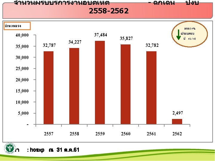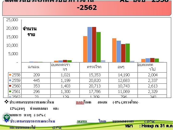 สดสวนผปวยงานอบตเหตแยกเวรตางๆ 2558 -2562 ปงบ จำนวนร าย 25, 000 20, 000 เช า 20, 176 18, 275 18, 199 17, 863 15, 000 13, 353 13, 930 12, 032 11, 069 10, 000 5, 000 3, 920 3, 955 4, 034 3, 514 1, 302 904 291 - 2558 2559 2560 2561 ทมา 2562 : Hos xp ณ 31 ต. ค. 6