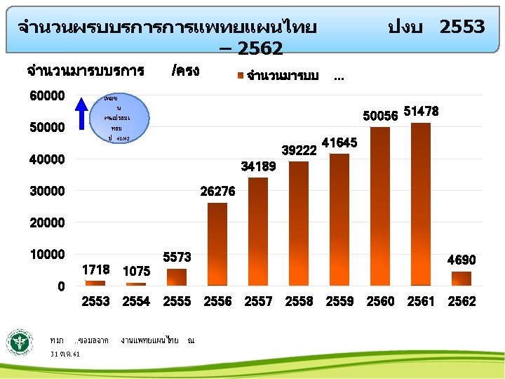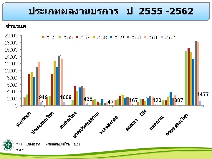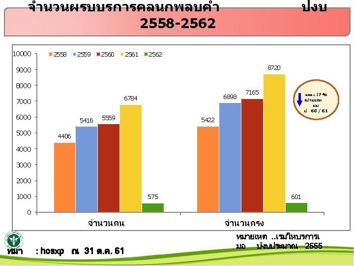 ผรบบรการกายภาพบำบด 2562 ปงบ 255321 -% 25000 เปรยบเท ยบ ป 61/62 20000 15000 10000 5000 0 จำนวนคน จำนวนครง 2553 2554 2555 2556 2557 2558 2559 2560 2561 2562 778 5651 6799 7293 8217 8584 8930 10381 10834 532 1614 7051 9408 10957 13420 15086 16016 18181 20293 1340 ทมา. . ขอมลจาก //server/PT ณ 31 ต. ค. 61