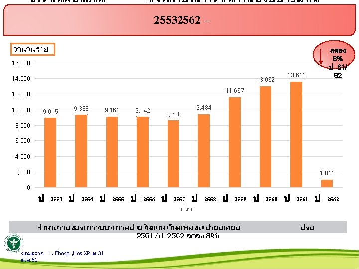 ใหบรการฟนฟ ปงบ 2553 -2562 จำนวนราย 14, 000 ลดลง 50% เปรยบเทยบ ป 61/62 12, 000 10, 000 8, 000 6, 000 4, 000 2, 000 รพ. 2553 1, 123 2554 1, 382 2555 2, 513 2556 6, 344 ทมา. . ขอมลจาก //server/PT ณ 3 1ต. ค. 61 2557 6, 920 2558 7, 634 2559 7, 632 2560 11, 755 2561 10, 654 2562 445