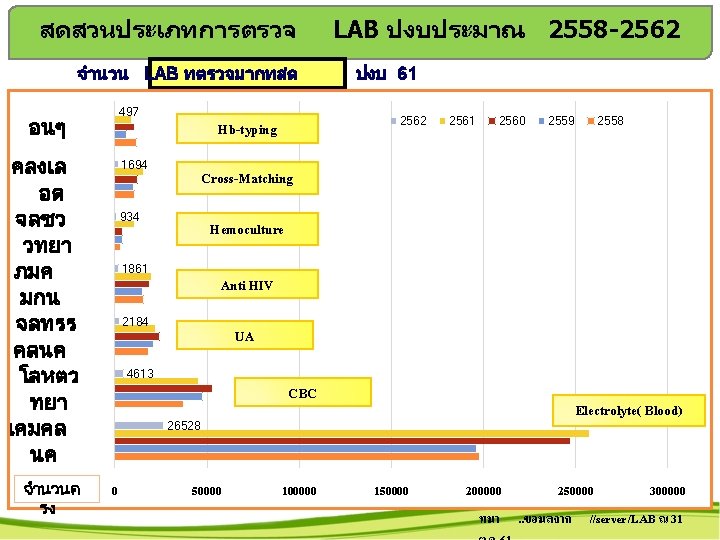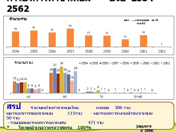 จำนวนกจกรรมบรการฝายชนสตร 2562 ปงบ 2553ลดลง79% เปรยบเทยบ ป 616/ 2 กจกรรมบรการทงหมด จำนวนคร ง 450000 386, 112 388, 881 400000 350000 294, 134 300, 376 300000 230, 808 250000 203, 896 200000 178, 893 150000 124, 796 137, 906 100000 50000 0 974 2553 997 2554 761 2555 ทมา. . ขอมลจาก //server/LAB ณ 31 ต. ค. 61 769 1191 932 2556 2557 2558 769 2559 517 2560 316 6, 7970 2561 2562