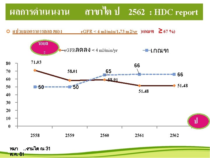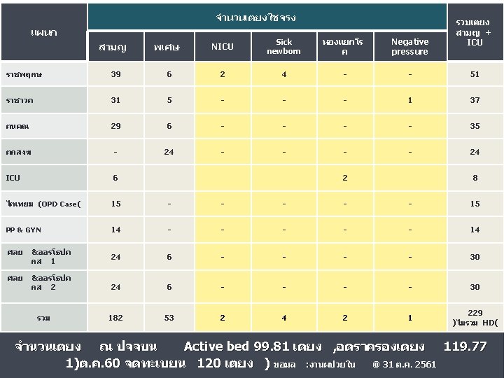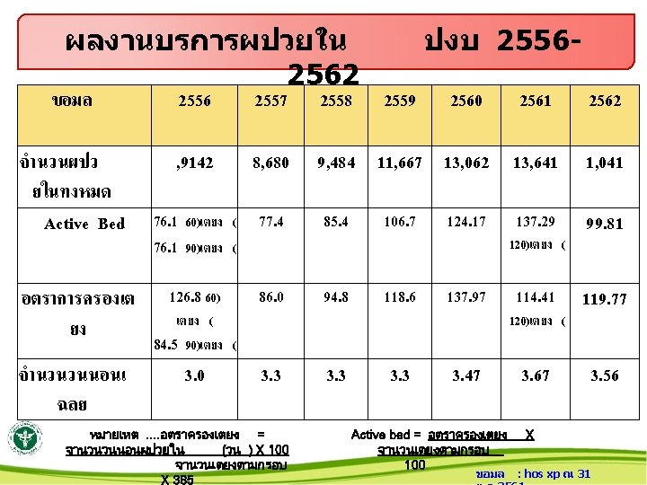 สถตบรการปงบประมาณ แยกรายตก เปรยบเทยบ 2558 - 2562 Active Bed ป 2558 – 2562 แยกรายตก 40. 0 35. 0 30. 0 25. 0 20. 0 15. 0 10. 0 5. 0 0. 0 2558 2559 2560 2561 2562 ราชพฤกษ (3 ราชาวด (30) ตนคณ 0) 28. 2 32. 8 33. 9 25. 2 22. 7 26. 1 30. 6 37. 5 24. 3 23. 0 (30)ตกสงฆ 25. 3 32. 2 34. 6 25. 4 23. 4 (24) 3. 7 9. 9 13. 4 12. 4 9. 8 LR(4) ICU(8) NICU(2) 7. 1 6. 3 5. 1 5. 7 5. 8 1. 4 2. 5 4. 3 4. 5 3. 7 0. 2 0. 4 0. 8 ขอมล ศลย 1(30) ศลย 0. 0 16. 0 20. 7 15. 8 2(30) 0. 0 16. 8 20. 2 16. 6 : hos xp ณ 31