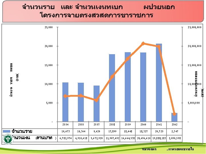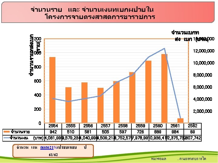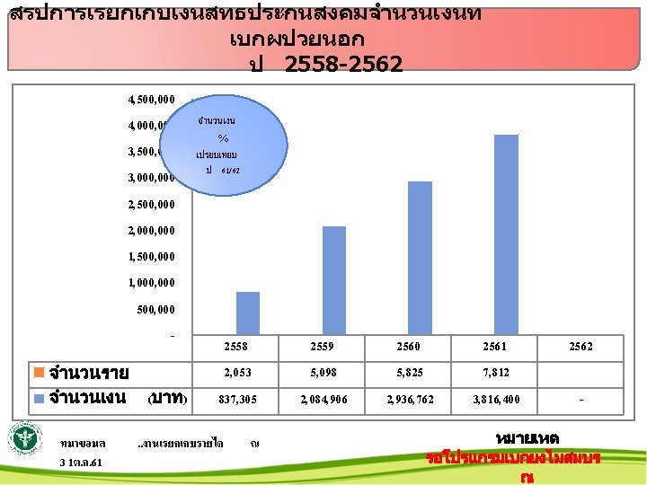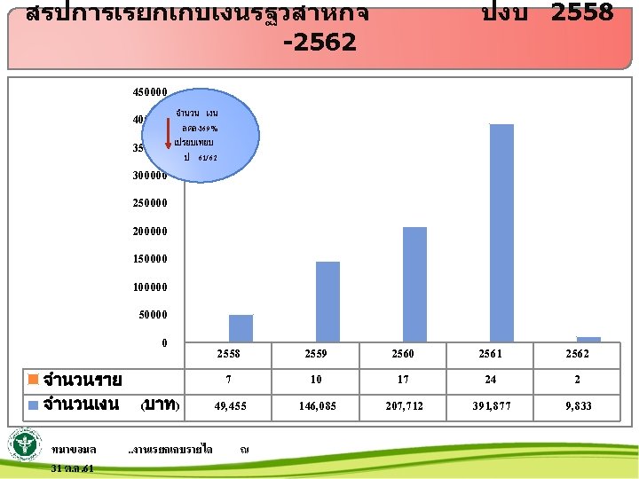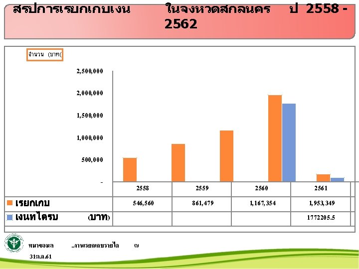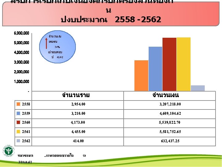 สรปการเรยกเกบเงน พรบ. รถ ป 25542562 5000000 4500000 4000000 3500000 3000000 2500000 2000000 1500000 1000000 500000 0 จำนวนราย จำนวนเงน ทมาขอมล 31ต. ค. 61 จำนวนเงน ลดลง 16% เปรยบเทยบ ป 61/62 2554 2555 2556 2557 2558 2559 2560 2561 2562 269 225 205 214 255 402 455 433 36 497, 546 452, 078 412, 543 576, 101 830, 026 3, 508, 504 3, 695, 064 4, 629, 816 306, 074. . งานเรยกเกบรายได ณ