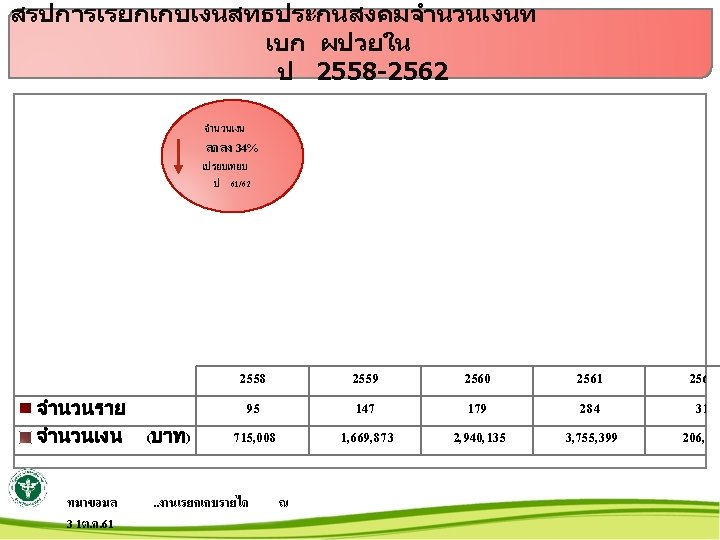 สถตบรการปงบประมาณ 2558 - 2562 เปรยบเทยบจำนวนรายและ Sum Adj RW ป 2557 – 2561 10, 210 7, 765. 61 12, 337 9, 908. 29 11, 779 11, 184. 56 11, 190 11, 008. 61 504 2558 2559 2560 จำนวนราย 2561 Sum Adj RW 533. 68 2562