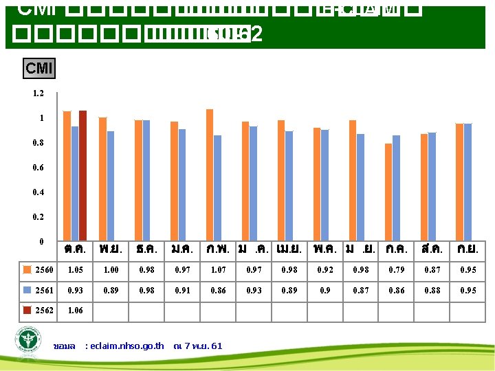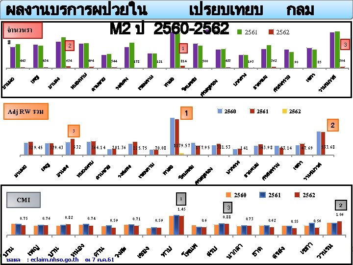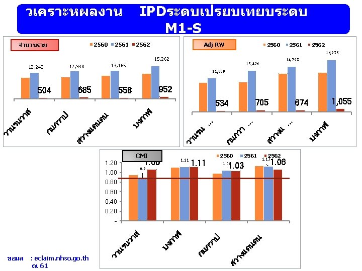 จำนวนราย โรงพยาบาล บานผอ เพญ บานดง หนองหาน ดานซาย วงสะพง เชยงคาน ทาบอ โพนพสย ศรบญเรอง นากลาง ธาตพนม ศรสงคราม เซกา วานรนวาส 2560 6, 945 7, 758 8, 860 8, 069 4, 431 7, 034 4, 924 12, 072 8, 086 6, 253 4, 367 6, 390 6, 244 6, 655 11, 779 2561 7, 980 7, 505 10, 281 8, 337 4, 796 8, 489 4, 933 11, 479 7, 532 6, 359 4, 367 7, 678 5, 404 6, 149 12, 242 Adj RW รวม 2562 443 434 654 494 344 178 121 814 300 435 193 562 90 85 504 2560 5, 946. 75 5, 666. 56 6, 126. 99 6, 365. 54 3, 018. 19 5, 485. 19 2, 673. 19 17, 576. 12 5, 995. 73 4, 876. 65 2, 905. 39 4, 570. 91 4, 615. 95 4, 743. 56 11, 184. 56 2561 6, 465. 20 5, 588. 38 7, 640. 64 6, 582. 31 3, 295. 12 6, 382. 59 2, 659. 28 16, 774. 35 4, 441. 66 5, 441. 92 3, 143. 48 5, 312. 49 3, 647. 17 5, 431. 22 11, 008. 61 CMI 2562 329. 45 329. 43 532. 00 364. 14 201. 36 125. 75 70. 08 1179. 57 177. 95 381. 53 141. 00 343. 98 53. 14 47. 69 533. 68 ขอมล 2560 0. 86 0. 73 0. 79 0. 68 0. 78 0. 55 1. 46 0. 75 0. 78 0. 67 0. 72 0. 74 0. 72 0. 95 2561 0. 81 0. 75 0. 80 0. 69 0. 76 0. 54 1. 47 0. 59 0. 86 0. 72 0. 69 0. 68 0. 88 0. 90 : eclaim. nhso. go. th 2562 0. 75 0. 76 0. 82 0. 74 0. 59 0. 71 0. 59 1. 45 0. 60 0. 88 0. 73 0. 62 0. 55 0. 56 1. 06 ณ 7