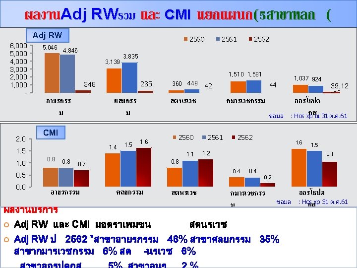 สถตบรการปงบประมาณ 2558 - 2562 แยกรายตก เปรยบเทยบ Sum Adj RW ป 2558 – 2562 แยกรายตก ขอมล ราชพฤกษ (3 ราชาวด (30) ตนคณ 0) 2558 2559 2560 2561 2562 1382. 00 1935. 95 2070. 84 1548. 53 149. 55 เปรยบเทยบ ขอมล 1952. 20 2661. 12 2502. 45 1696. 33 161. 69 1858. 80 2766. 63 3466. 58 1767. 03 148. 82 (15) 263. 24 1185. 59 1941. 73 1936. 88 142. 08 PP&สต นรเวช (14) ICU(8) NICU(2) 272. 61 328. 96 302. 92 353. 28 35. 00 151. 61 143. 72 288. 38 169. 41 14. 92 5. 85 79. 54 143. 51 83. 15 6. 03 PP&สต นรเวช (14) ICU(8) NICU(2) 0. 23 0. 32 0. 34 0. 37 0. 47 1. 94 2. 32 1. 35 0. 39 4. 19 4. 78 3. 01 1(30) ศลย 0. 00 295. 75 2239. 95 160. 96 2(30) 0. 00 261. 23 2242. 53 163. 60 CMI ป 2558 – 2562 แยกรายตก : hos xp ณ 31 ต. ค. 61 ราชพฤกษ (30 ราชาวด (30) ตนคณ ) 2558 2559 2560 2561 2562 (30) ตกสงฆ : hos xp ณ 3 1ต. ค. 61 0. 42 0. 49 0. 46 0. 63 0. 77 0. 87 0. 77 0. 80 0. 96 0. 77 0. 97 1. 11 0. 85 (30) ตกสงฆ 0. 70 1. 06 1. 27 1. 34 1. 48 (15) ศลย 1(30) ศลย 0. 00 1. 35 1. 23 1. 20 2(30) 0. 00 1. 26 1. 20 1. 21