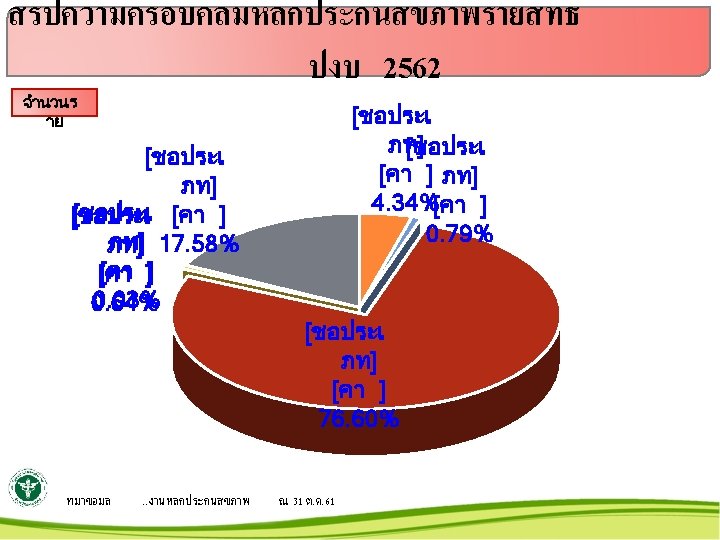 สรปความครอบคลมหลกประกนสขภาพ รอยละ 100 99. 98 99. 96 99. 94 99. 92 99. 9 99. 88 99. 86 99. 84 99. 82 99. 8 99. 97 99. 99 99. 98 99. 97 99. 96 99. 95 99. 93 99. 91 99. 87 ต. ค. พ. ย. ธ. ค. ม. ค. ก. พ. ป 2559 99. 93 99. 87 99. 91 99. 95 99. 91 ป 2560 99. 98 99. 99 ป 2561 99. 97 99. 96 99. 98 2562 99. 96 ทมาขอมล ป 2559 -2562 . . งานหลกประกนสขภาพ ณ 31 ต. ค. 61 99. 89 ม. ค. 99. 89 99. 98 99. 96 99. 91 เม. ย. 99. 91 99. 98 99. 96 99. 91 99. 92 99. 87 พ. ค. ม. ย. 99. 87 99. 91 99. 98 99. 96 99. 97 ก. ค. ส. ค. ก. ย. 99. 92 99. 97 99. 96 99. 97
