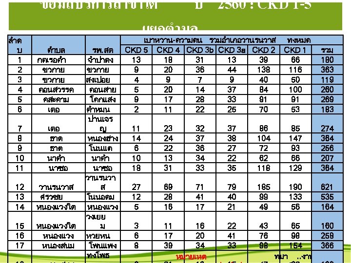 10อนดบโรคผปวยนอกรายป ลำด บ ปงบ 2558 จำนวน ปงบ 2559 จำนวน ปงบ 2560 จำนวน ขอมล 2561 ปงบ 2561 : hos xp ณ 31 ต. ค. จำนวน ปงบ 2562 จำนวน 1 DM 16, 927 HT 15, 992 ESRD 15, 677 ESRD 16, 816 ESRD 1, 554 2 HT 16, 792 DM 13, 621 DM 13, 536 HT 11, 380 HT 1, 213 3 Low back pain 4, 542 ESRD 9, 327 HT 11, 086 DM 10, 978 DM 1, 125 4 DM with Renal 4, 506 Low back pain 5, 182 Dyspepsia 5, 289 Dyspepsia 5, 635 Myalgia 536 5 ESRD 3, 960 Dyspepsia 4, 585 Myalgia 5, 987 Myalgia 5, 597 Dyspepsia DM with Renal 4, 327 DM with Renal 3, 847 DM with Renal 3, 157 DM with Renal HIV 3, 278 HIV 3, 162 HIV 6 7 Dyspepsia 3, 939 Dental caries 2, 683 429 330 3, 094 Dental caries 279 8 Asthma 2, 353 Dental caries 2, 914 Acute pharyngitis 2, 714 Asthma 2, 987 HIV 265 9 HIV 2, 268 DM with neurological 2, 879 Asthma 2, 615 Common cold 2, 419 Asthma 246 10 Acute Pharyngitis 1, 979 Mental and behavioural disorders due to stimulants 222 2, 188 Asthma 2, 447 Common clod 2, 293 Thyrotoxicosis