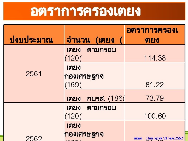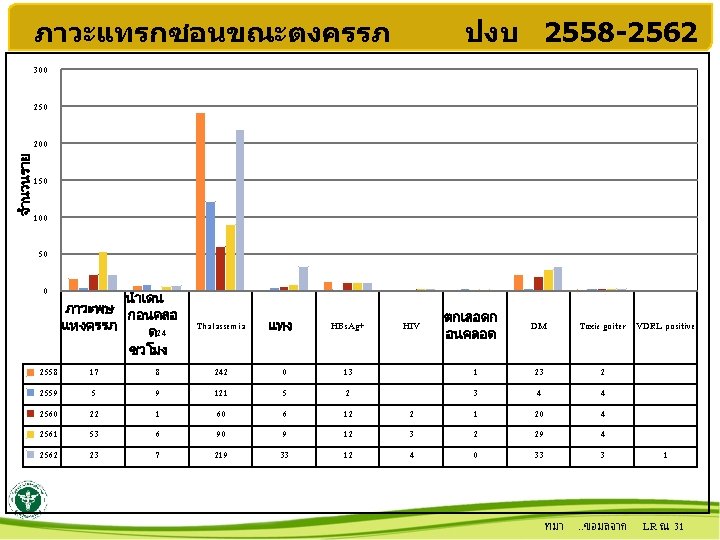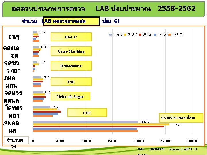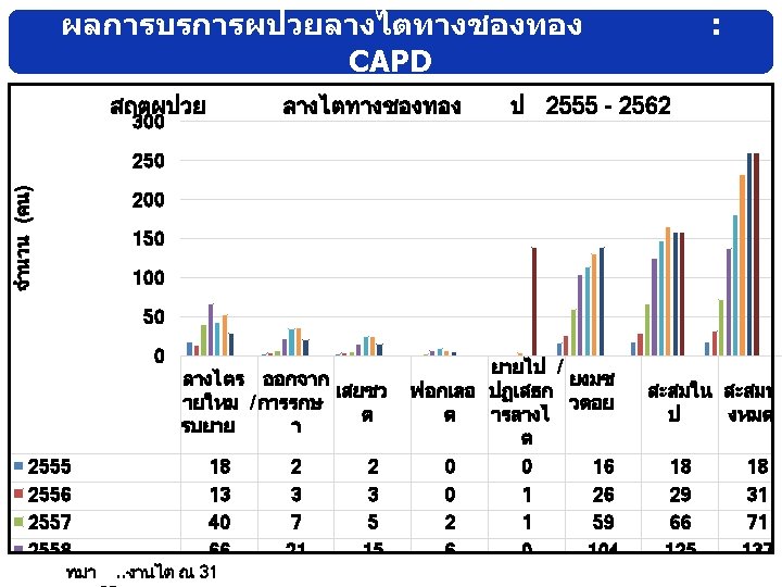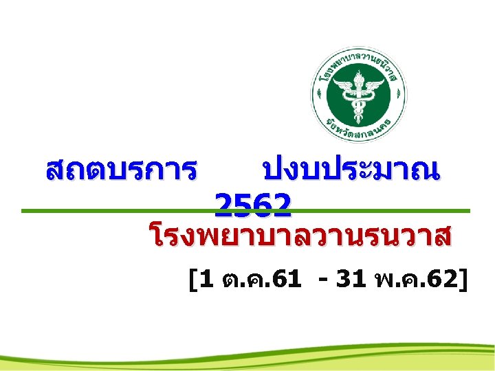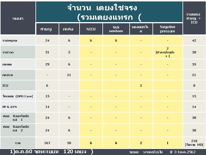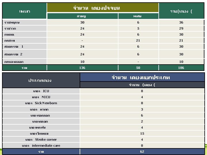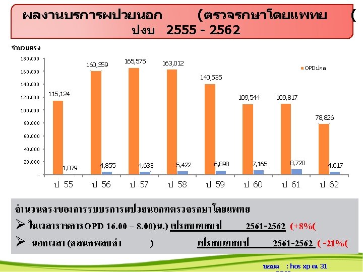 สถตบรการปงบประมาณ 2558 - 2562 แยกรายตก เปรยบเทยบจำนวนราย ป 2558 – 2562 แยกรายตก ขอมล ราชพฤกษ (3 ราชาวด (30)ตนคณ 0) 2558 2559 2560 2561 2562 3316 3967 4232 3210 1938 2537 3053 3234 1996 1399 94. 1 109. 5 112. 9 84. 0 77. 6 86. 9 101. 8 125. 0 81. 0 70. 8 (21) PP(10) 2427 376 1167 2856 1119 1014 เปรยบเทยบอตราครองเตยง 3097 1521 882 2171 1439 954 1389 784 701 ราชพฤกษ (3 ราชาวด (30)ตนคณ 0) 2558 2559 2560 2561 2562 (30)ตกสงฆ (21 (30) ) 84. 4 107. 4 15. 3 84. 7 73. 2 23. 0 61. 7 63. 8 59. 1 45. 2 ICU(8) 78 74 305 431 302 PP(10) ICU(8) 89. 1 157. 2 127. 8 40. 4 71. 9 45. 0 62. 5 53. 9 56. 4 39. 9 ป : hos xp ณ 31 พ. ค. 62 NICU(4) ศลย 1(30) ศลย 2(30) 15 0 0 19 – 2562 0 แยกรายตก 0 2558 30 221 207 ขอมล : hos xp ณ 31 พ. ค. 62 22 1820 1867 20 1081 1088 NICU(4) ศลย 9. 5 10. 3 41. 9 20. 3 13. 6 1(30)ศลย 0. 0 53. 3 68. 9 59. 3 2(30) 0. 0 56. 0 67. 5 59. 3