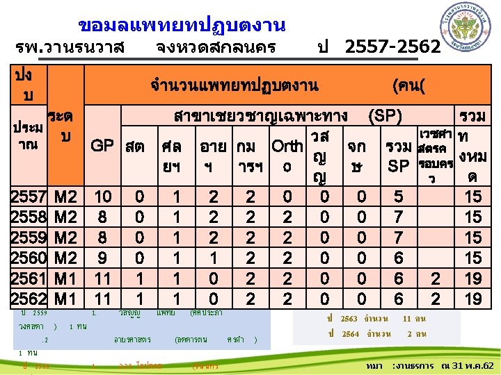 แนวโนมผรบบรการงานเอกซเรย 2562 ปงบ 2553 - 25000 21864 จำนวนครง จำนวนคน 20000 17247 15000 11252 8729 10000 10472 8249 12010 9500 8231 22755 8859 9197 13342 13215 14720 13777 15629 10648 10312 6387 5000 0 53 54 55 56 57 58 59 60 61 62 31 29 26 24 33 37 47 60 68 64 คาเฉล ยคน / วน ทมา ปรมาณงานเพมขน เปรยบเทยบ ป 2561256/2 = เพมขน 3%. . Hos xp ณ 31 พ. ค. 62