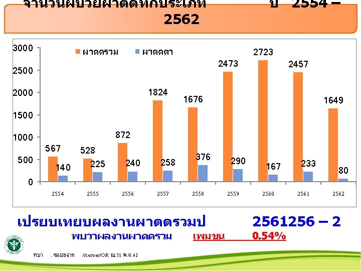 จำนวนผาตดแยกแผนก 1600 1494 1362 1400 2558 2559 2560 2561 2562 1184 1045 1000 798 800 854 819 777 486 73 73 87 122 46 167 เว าร กม ะด ก ศล ยก ร รม กร ศล ยก รร 80 25 0 1 ตา ม ช 0 ทมา. . ขอมลจาก //server/OR ณ 31 พ. ค. 62 233 42 172 84 93 85 ช 200 162 เว 376 290 400 นร 600 สต 1200 ปงบ 2558 -2561 113147