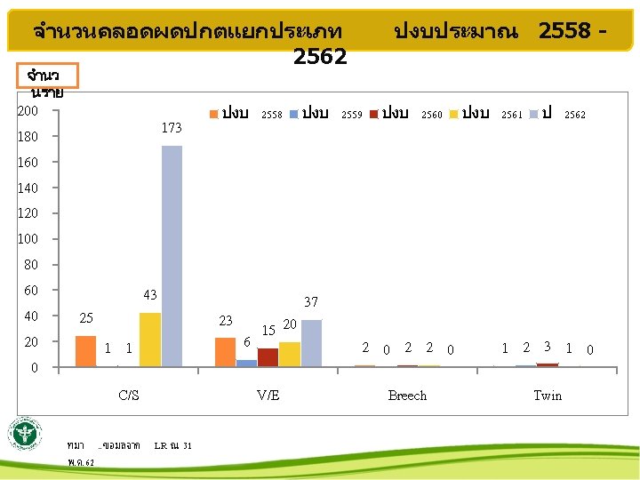 จำนวนรอคลอดและมารดาคลอด ป 2553 - 2562 จำนวนคน 1200 1030 1000 800 934 810 902 907 รอคลอด 994 881 922 798 773 895 728 คลอด 842 660 818 631 นรเวช 811 634653 600 532 400 200 71 0 2553 2554 2555 ทมา. . ขอมลจาก LR ณ 31 พ. ค. 62 2556 2557 2558 2559 2560 2561 2562 ปงบ