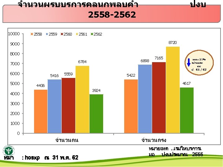 ผรบบรการกายภาพบำบด 2562 ปงบ 25532% 25000 เปรยบเท ยบ ป 61/62 20000 15000 10000 5000 0 จำนวนคน จำนวนครง 2553 2554 2555 2556 2557 2558 2559 2560 2561 2562 778 5651 6799 7293 8217 8584 8930 10381 10834 8056 1614 7051 9408 10957 13420 15086 16016 18181 20293 13250 ทมา. . ขอมลจาก //server/PT ณ 31 พ. ค. 62