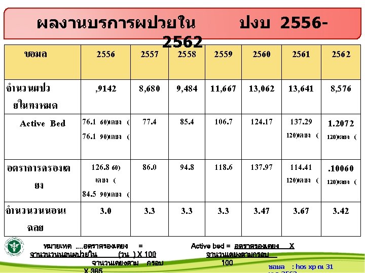 สถตบรการปงบประมาณ 2558 - 2562 เปรยบเทยบจำนวนรายและ Sum Adj RW ป 2558 – 2562 10, 210 7, 765. 61 2558 เปรยบเทยบ 103. 9 12, 337 9, 908. 29 11, 779 11, 184. 56 12, 920 11, 572. 16 Sum adj RW ลดลง7% 7, 489 7, 212. 46 2559 2560 จำนวนราย Active Bed และอตราครองเตยง 128. 8 137. 8 116. 0 124. 0 2561 Sum Adj RW 2562 ป 2558 – 2562 137. 3 114. 4 93. 5 CMI 252562 – 58 0. 97 0. 95 120. 7 100. 6 0. 9 0. 84 2558 2559 2560 Active Bed 2561 2562 อตราครองเตยง 2558 ขอมล 2559 2560 2561 2562 : eclaim. nhso. go. th ณ 31 พ. ค. 62