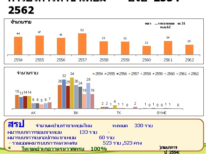 จำนวนกจกรรมบรการฝายชนสตร 2562 ปงบ 2553เพมขน เปรยบเทยบ ป 616/ 2 กจกรรมบรการทงหมด จำนวนคร ง 12% 450000 386, 112 388, 881 400000 350000 294, 134 300, 376 300000 290, 945 230, 808 250000 203, 896 200000 178, 893 150000 124, 796 137, 906 100000 50000 0 974 2553 997 2554 761 2555 ทมา. . ขอมลจาก //server/LAB ณ 31 พ. ค. 62 769 1191 932 2556 2557 2558 769 2559 517 2560 316 2561 307 2562
