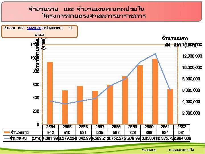 จำนวนร าย 1400 ใหบรการเยยมบาน 2562 1204 1200 1000 935 800 600 993 728 1071 ปงบ 25533% 1160 เปรยบเท ยบ ป 61/62 1074 1142 780 606 400 200 0 2553 2554 2555 2556 2557 2558 2559 2560 2561 2562 ทมา. . ขอมลจาก //server/PT ณ 31 พ. ค. 62