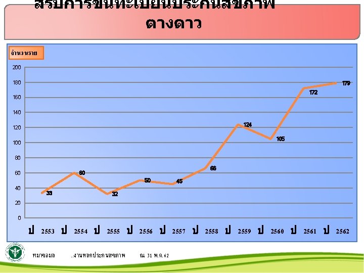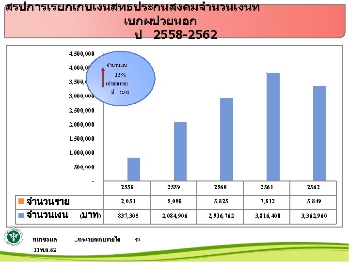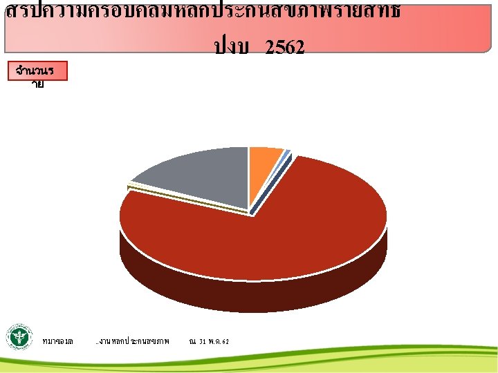 สรปความครอบคลมหลกประกนสขภาพ รอยละ 100 99. 98 99. 96 99. 94 99. 92 99. 9 99. 88 99. 86 99. 84 99. 82 99. 8 99. 97 ทมาขอมล 99. 99 99. 98 99. 97 99. 96 99. 95 99. 93 99. 91 99. 87 ต. ค. ป 2559 99. 93 ป 2560 99. 98 ป 2561 99. 97 2562 99. 96 ป 2559 -2562 พ. ย. ธ. ค. ม. ค. ก. พ. 99. 87 99. 91 99. 95 99. 91 99. 99 99. 98 99. 99 99. 96 99. 98 99. 97 99. 96 . . งานหลกประกนสขภาพ ณ 31 พ. ค. 62 99. 89 ม. ค. 99. 89 99. 98 99. 96 99. 97 99. 91 เม. ย. 99. 91 99. 98 99. 96 99. 97 99. 91 99. 92 99. 87 พ. ค. ม. ย. 99. 87 99. 91 99. 98 99. 96 99. 97 99. 96 ก. ค. ส. ค. ก. ย. 99. 92 99. 97 99. 96 99. 97
