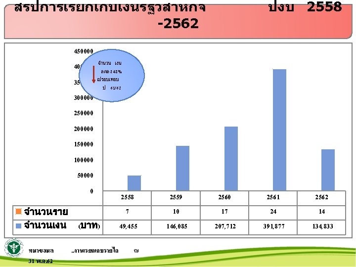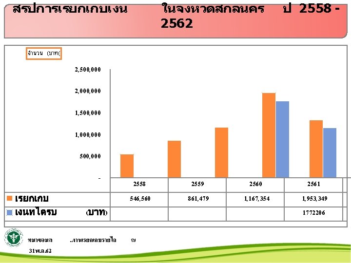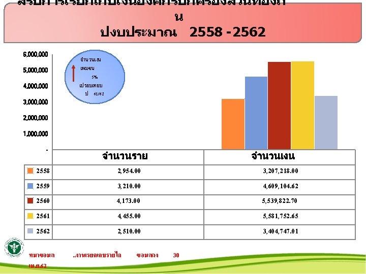 สรปการเรยกเกบเงน พรบ. รถ ป 25542562 5000000 4500000 4000000 3500000 3000000 2500000 2000000 1500000 1000000 500000 0 จำนวนราย จำนวนเงน ทมาขอมล 31พ. ค. 62 จำนวนเงน เพมขน 10 % เปรยบเทยบ ป 61/62 2554 269 497, 546 2555 225 452, 078 . . งานเรยกเกบรายได 2556 205 412, 543 ณ 2557 214 576, 101 2558 2559 2560 2561 256 255 402 455 433 34 830, 026 3, 508, 504 3, 695, 064 4, 629, 816 3, 384