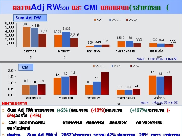 สถตบรการปงบประมาณ 2558 - 2562 แยกรายตก เปรยบเทยบ Sum Adj RW ป 2558 – 2562 แยกรายตก ขอมล ราชพฤกษ (3 ราชาวด (30) ตนคณ 0) 2558 2559 2560 2561 2562 1382. 00 1935. 95 2070. 84 1548. 53 1042. 52 เปรยบเทยบ ขอมล 1952. 20 2661. 12 2502. 45 1696. 33 1172. 54 1858. 80 2766. 63 3466. 58 1767. 03 1156. 46 (21) 263. 24 1185. 59 1941. 73 1936. 88 1047. 31 PP(10) ICU(8) NICU(4) 272. 61 328. 96 302. 92 353. 28 388. 32 151. 61 143. 72 288. 38 169. 41 147. 48 5. 85 79. 54 143. 51 83. 15 54. 73 PP(10) ICU(8) NICU(4) 0. 23 0. 32 0. 34 0. 37 0. 50 1. 94 2. 32 1. 63 0. 39 4. 19 4. 78 3. 78 2. 73 1(30) ศลย 0. 00 295. 75 2239. 95 1492. 05 2(30) 0. 00 261. 23 2242. 53 1349. 03 CMI ป 2558 – 2562 แยกรายตก : hos xp ณ 31 พ. ค. 62 ราชพฤกษ (30 ราชาวด (30) ตนคณ ) 2558 2559 2560 2561 2562 (30) ตกสงฆ : hos xp ณ 31 พ. ค. 62 0. 49 0. 46 0. 53 0. 77 0. 87 0. 77 0. 80 0. 83 0. 77 0. 97 1. 11 0. 83 (30) ตกสงฆ 0. 70 1. 06 1. 27 1. 34 1. 33 (21) ศลย 1(30) ศลย 0. 00 1. 35 1. 23 1. 38 2(30) 0. 00 1. 26 1. 20 1. 24