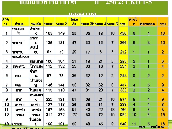 10อนดบโรคผปวยนอกรายป ลำด บ ปงบ 2558 จำนวน ปงบ 2559 จำนวน ปงบ 2560 จำนวน ขอมล : hos xp ณ 31 พ. ค. 2562 ปงบ 2561 จำนวน ปงบ 2562 จำนวน 1 DM 16, 927 HT 15, 992 ESRD 15, 677 ESRD 16, 816 ESRD 13, 759 2 HT 16, 792 DM 13, 621 DM 13, 536 HT 11, 380 HT 10, 313 3 Low back pain 4, 542 ESRD 9, 327 HT 11, 086 DM 10, 978 DM 8, 114 4 DM with Renal 4, 506 Low back pain 5, 182 Dyspepsia 5, 289 Dyspepsia 5, 635 Dyspepsia 4, 082 5 ESRD 3, 960 Dyspepsia 4, 585 Myalgia 5, 987 Myalgia 5, 597 6 Dyspepsia 4, 327 DM with Renal 3, 847 HIV 3, 278 HIV 3, 162 HIV 7 3, 939 DM with Renal Dental caries 2, 683 DM with Renal 3, 037 HIV 2, 254 3, 094 Asthma 2, 115 2, 987 Myalgia 1, 909 DM with Renal 3, 157 8 Asthma 2, 353 Dental caries 2, 914 Acute pharyngitis 2, 714 Asthma 9 HIV 2, 268 DM with neurological 2, 879 Asthma 2, 615 Common cold 10 Acute Pharyngitis 2, 188 Asthma 2, 447 Common clod 2, 293 Thyrotoxicosis 1, 979 2, 419 Thyrotoxicosis 1, 906 Dental caries 1, 767