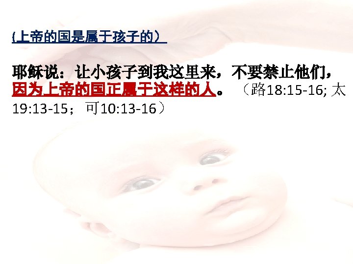 (3) 圣餐也表明信徒同为一个肢体, 是属于耶稣基督的身 体。所以我们应当彼此相爱(林前10: 17)。 The Lord supper points toward the union of believers as members in the one body of Christ and therefore we ought to love one another.