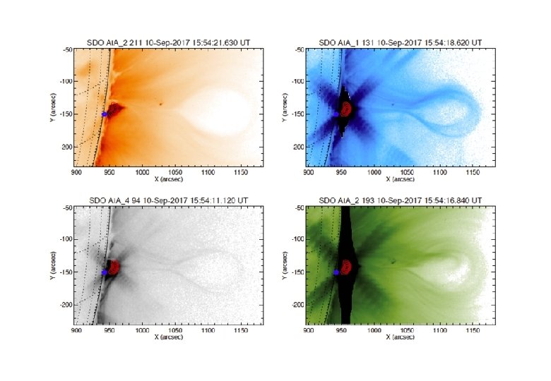 Remarkably, the spacings between the pairs of these three events were similar to the recent mean solar-cycle duration of 11. 1 years (at separations of (10. 37 and 10. 74 years, respectively, shorter by only a few percent). While not very significant, these spacings are eerie - in each of the last three cycles, a "last best" event has happened, and at almost exact intervals. RHESSI Observation: RHESSI got excellent observations of SOL 2017 -09 -10, as illustrated in Figure 1. The flare was almost exactly at the limb, apparently such that one ribbon was entirely occulted and the other partially so, but still nicely showing both white-light flare continuum and hard X-rays with the same precise coincidence seen in events on the disk, confirming the 3 D nature of this identification. Figure 1: Imaging observations of SOL 2017 -09 -10 at high resolution. Upper panel, comparisons of RHESSI hard X-rays with the HMI white-light flare observation (footpoint); bottom panel, same RHESSI images compared with AIA 193 Å (looptop). This flare also produced a textbook example of CME ejection and the generation of a global wave. Figure 2 illustrates the canonical plasmoid/current-sheet pattern most clearly, with the very linear current-sheet EUV enhancement pointing straight at the loops seen by RHESSI and AIA. Figure 2: SOL 2017 -09 -10 produced a massive, fast CME, and in its wake this textbook-clear example of plasmoid and current sheet trailing it. Note the beautiful diffraction spikes produced by AIA's grids. This can be exploited in principle to increase the image dynamic range and also to provide spectral information.