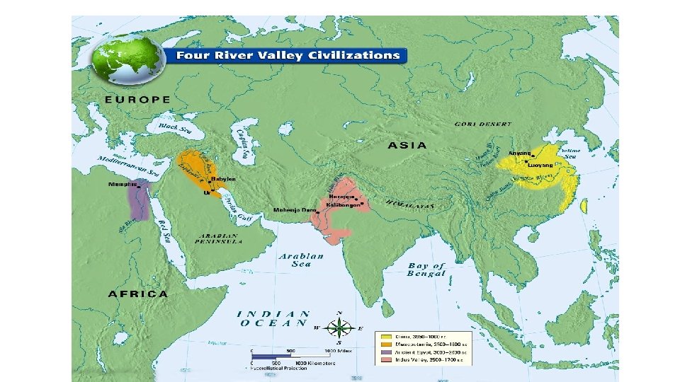 #1. Where did all the world’s civilizations arise (where did the people decide to settle and build a civilization—think geography)? • RIVER VALLEYS • All civilizations needed access to fresh water (NOT THE OCEAN, a RIVER!) • Rivers gave drinking water and an ability to water crops. • Farming is the ONLY reason people started to settle down and form civilizations in the first place!