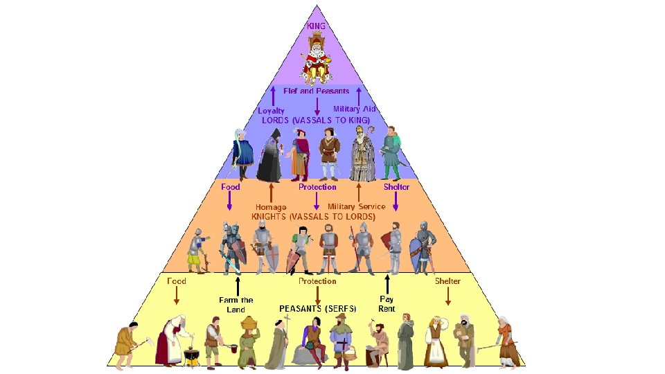 Wait…. What's Feudalism? ? ? • The dominant social system in medieval Europe • The nobility held lands from the Crown(KING) in exchange for military service(which will be provided by KNIGHTS), and vassals were in turn tenants of the nobles • The peasants (or serfs) were obliged to live on their lord's land give him homage(honor), labor and a share of the produce, in exchange for military protection.