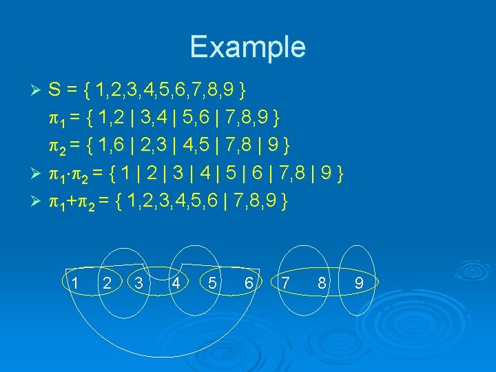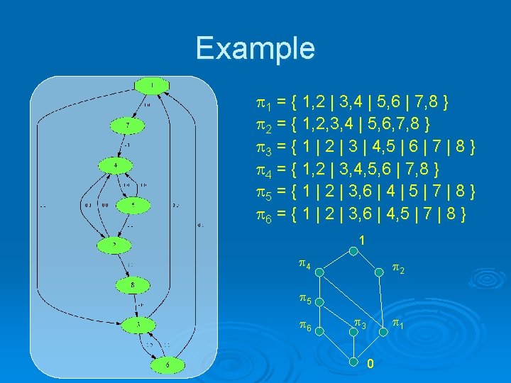 Example Ø Lattice of subsets of S={1, 2, 3} Ø Lattice of partitions on S={1, 2, 3} {1, 2} {1, 3} {1, 2, 3} {1, 2 | 3} {1} {2} {1, 3|2} {1 | 2, 3} {1 | 2 | 3}