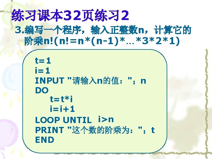 4. P 33页B组T 2. 程序 n=1 p=1000 WHILE n<=7 p=p*(1+0. 5) n=n+1 WEND PRINT p END
