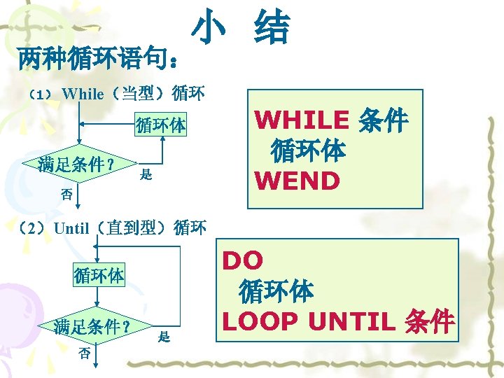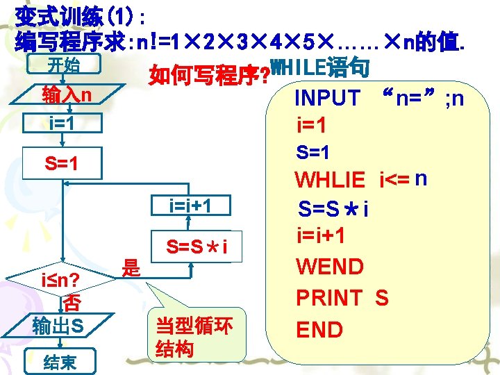 变式训练(2): 编写程序求: 1× 3× 5× 7×……× 101的值. 直到型 开始 如何写程序? UNITL语句 i=1 S=0 S=S*i S=S+i i=i+2 i=i+1 i>100? i>101? 是 输出S 结束 否 i=1 S=0 S=1 DO S=S+i S=S*i i=i+1 i=i+2 LOOP UNTIL i>100 101 PRINT S END