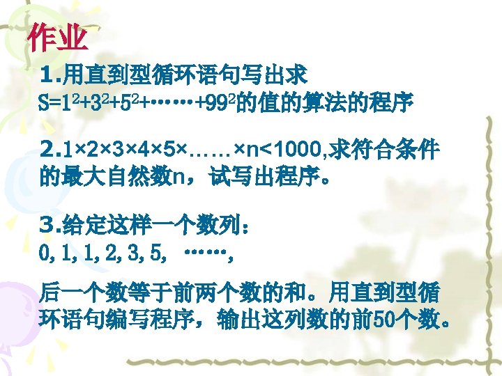 5. P 33页B组T 4. 程序 INPUT “a=”; a INPUT “n=”; n s=0 i=1 WHILE i<=n S=S+a a=a+10 * a i=i+1 WEND PRINT s END