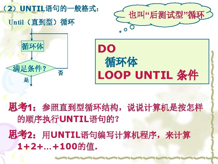 思考2:用UNTIL语句编写计算机程序,来计算 1+2+…+100的值. 程序: 程序框图: 开始 i=1 sum=0 sum=sum+I i=i+1 i>100? 是 输出sum 结束 否 i=1 sum=0 DO sum=sum+i i=i+1 LOOP UNTIL i>100 PRINT sum END
