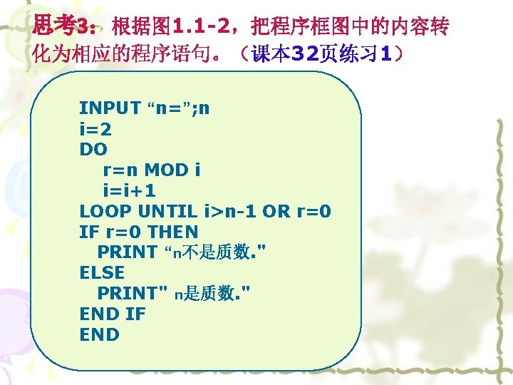 2、设计一个算法框图:求满足 1+2 + 3 + … + n> 10000 的最小正整数n,并写出相应的QBASIC程序。 开始 i=0,Sum=0 i=i+1 i=0 sum = 0 DO i=i+1 Sum=Sum+i 否 Sum>10000? 是 输出i sum = sum + i LOOP UNTIL sum>10000 PRINT i END 结束