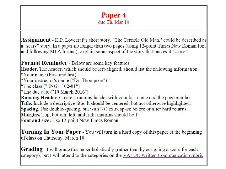 Schedule: Today: 3/1 Bring copy of “Book” paper for evaluation. Read “The Terrible Old Man. ” HW: Begin work on “Old Man” paper (Paper #4). Thursday: Bring “Old Man” work to class. 3/3 HW: Write complete draft of “Old Man” paper. Tuesday: Bring complete draft of “Old Man” paper. 3/8 HW: Revise “Old Man” paper; submit to turnitin. com. Thursday: Turn in “Old Man” paper. 3/10
